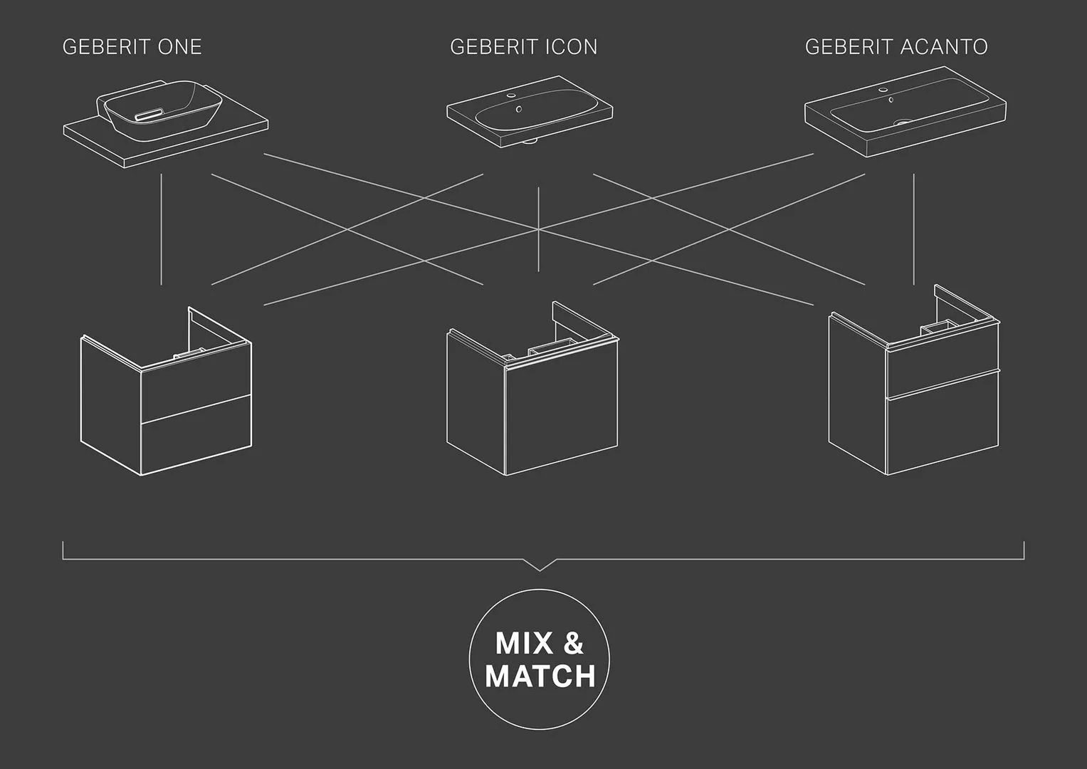Mit Geberit ONE hat der Hersteller seit einigen Jahren eine Badserie auf dem Markt, deren Bestandteile sich so gut miteinander kombinieren lassen, dass über 2.000 verschiedene Designvarianten realisierbar sind. Dem individuellen Geschmack waren bislang aber Grenzen gesetzt. Zum Beispiel, wenn ein bestimmter Waschtisch von ONE am besten gefiel, aber Möbel mit Griffen oder Glasfronten bevorzugt wurden. Mit dem Konzept Mix & Match werden Bauform und Technik vereinheitlicht, das individuelle Design der jeweiligen Serie bleibt bestehen. So kann der Kunde Waschtische mit sämtlichen Waschtischunterschränken der Geberit Serien ONE, iCon und Acanto kombinieren.