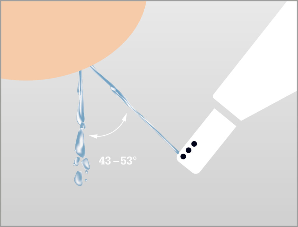 Der Winkel der ausgefahrenen Düse ist entscheidend, damit keine Fäkalienreste auf die Düse fallen. Ein Winkel von 43 ° ist hier optimal.